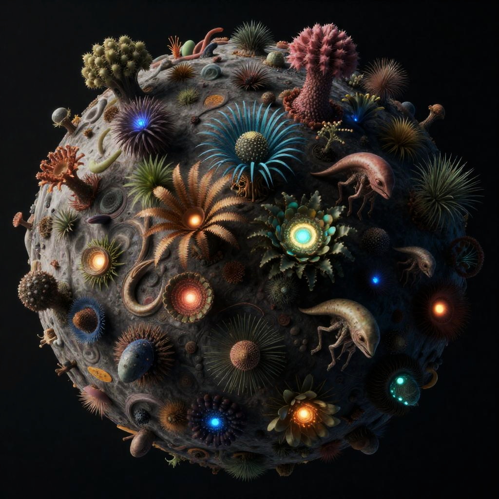 Masterpiece, best quality, (realistic, highly detailed), surface of an alien planet, alien plants, (alien animals:1.4), wondrous, colorful, otherworldly, bioluminescent, glowing