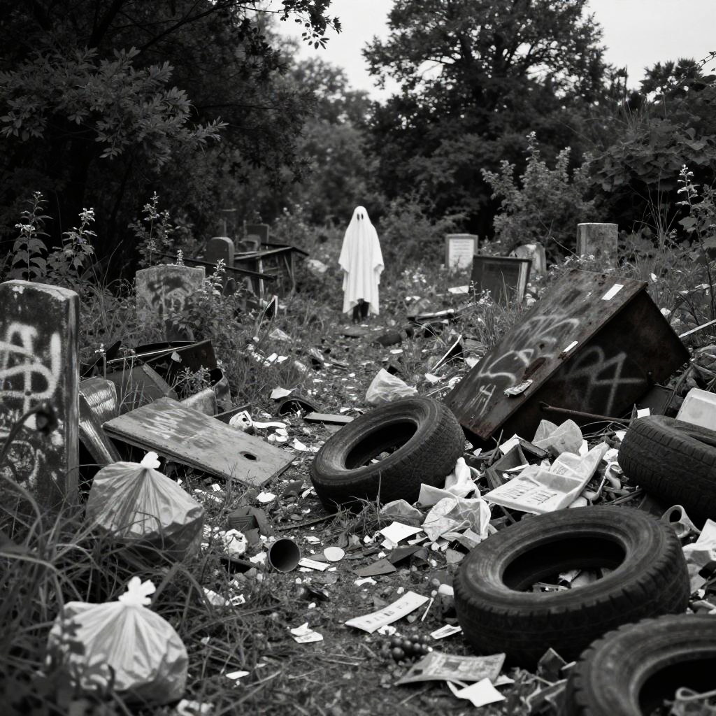 Realistic photo.phantom ghost standing upright in broad daylight in the distance, overgrown graveyard, trash, debris, vacant, abandoned, destitute, lush weeds, woods overgrown, detritus, litter, junk, garbage, graffiti, dump, rusty, aftermath, crumbling, bricks, plastic, drywall, junk, plastic bags, paper litter, tires, scrap metal, black and white classic film realistic photo
