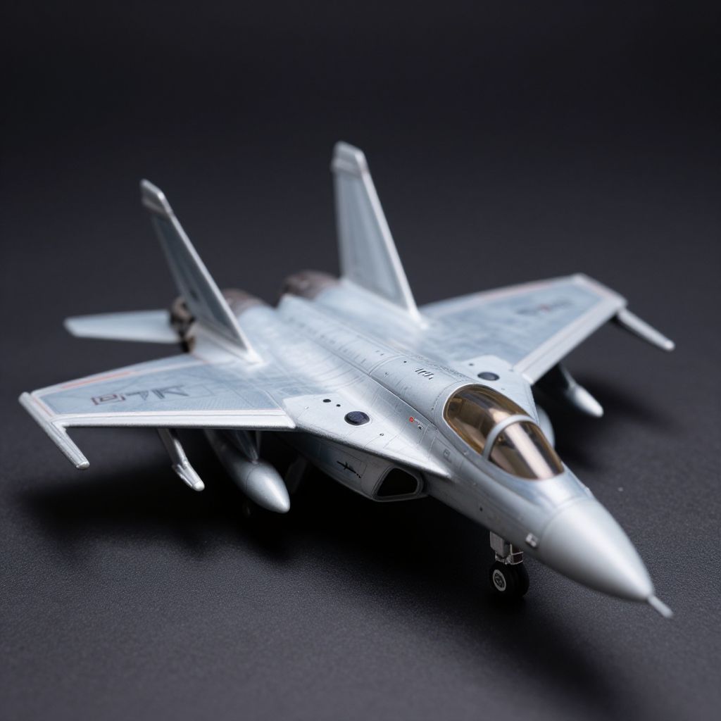 Photograph of a detailed, silver, multi-role fighter jet model with clear cockpit, positioned against a dark, textured background.