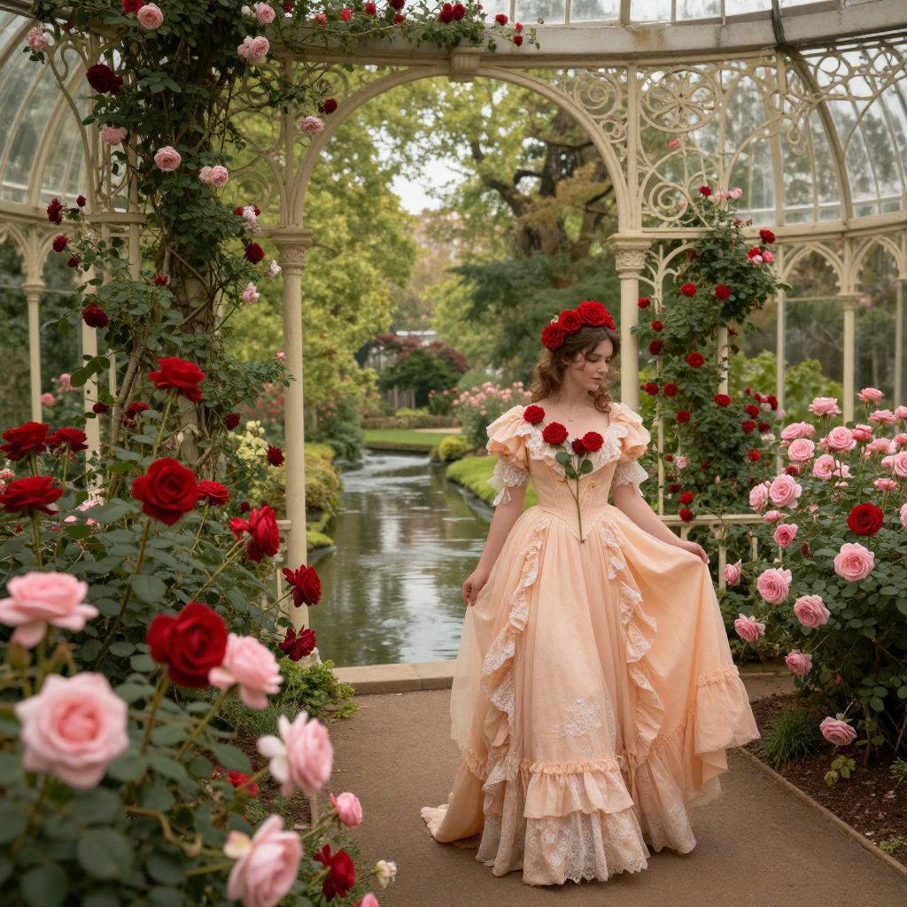 Photograph of a fair-skinned woman in a pale peach, Victorian-style dress adorned with red roses, standing in a glass conservatory surrounded by blo