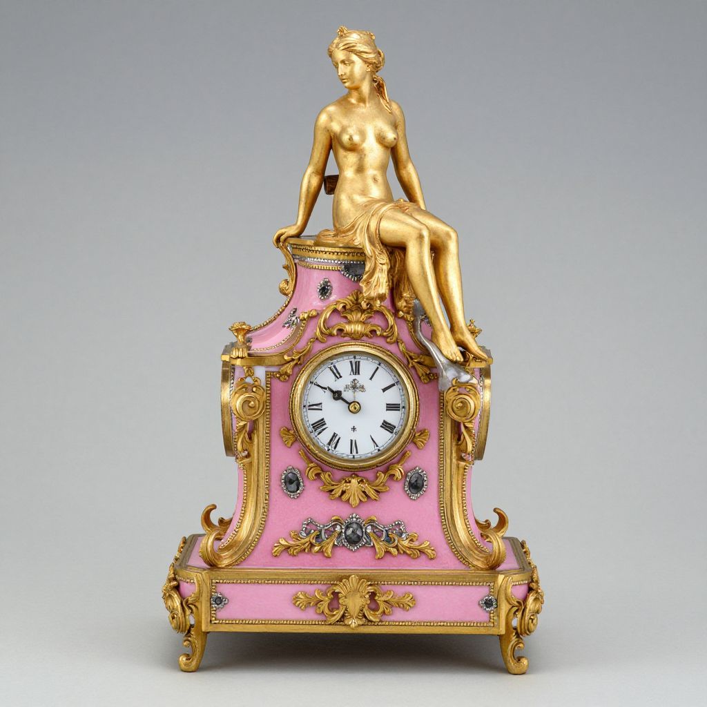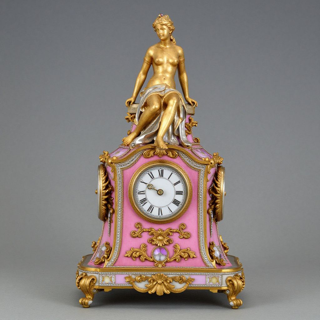 Elegant French antique clock featuring a pink jeweled porcelain body adorned with ornate gold ormolu detailing, silver highlights, and a central figure of a gilded nude woman seated atop the clock face.