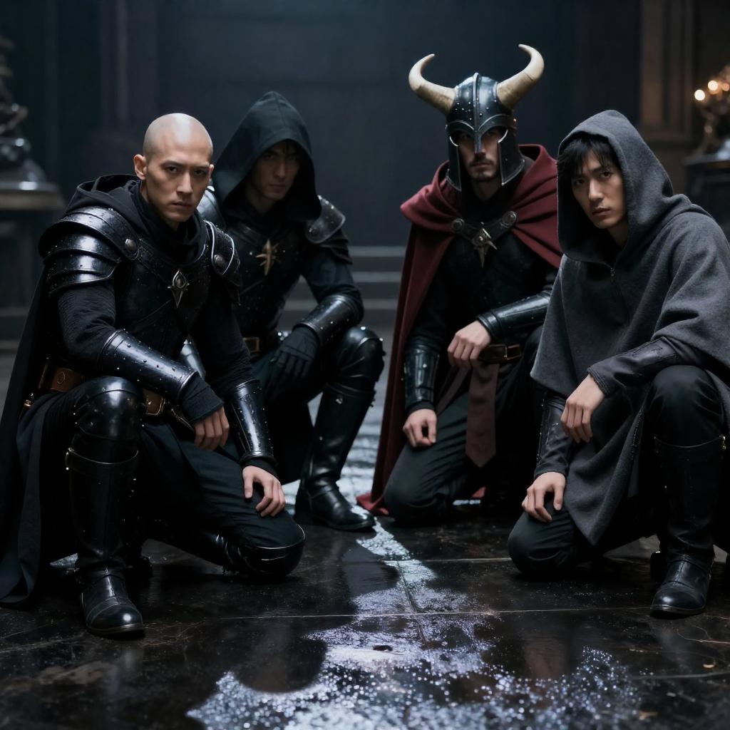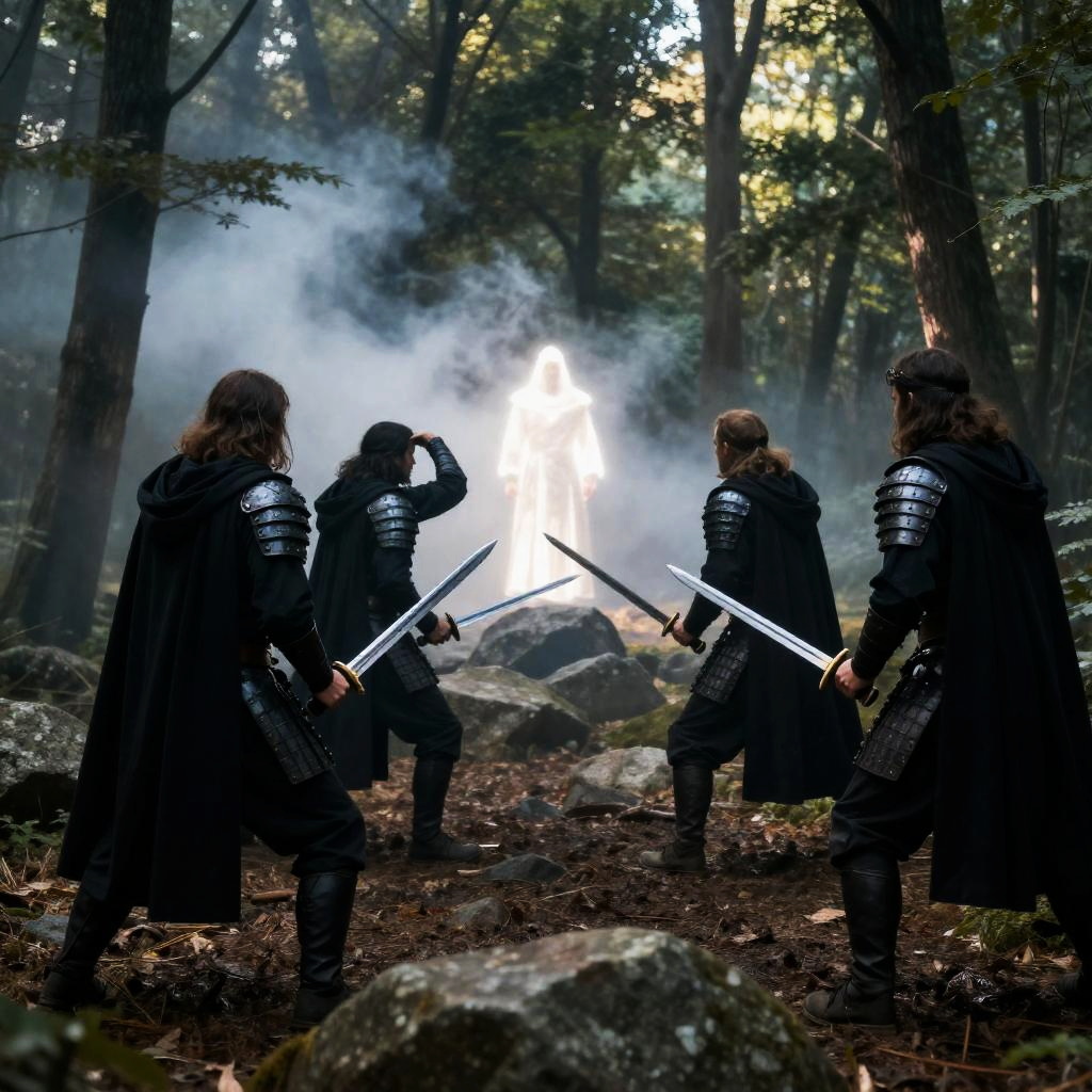 A dramatic forest scene showing four medieval warriors with long hair and black cloaks and armor, holding swords as they confront a glowing figure dressed in white robes. Sunlight filters through dense trees, illuminating the smoky atmosphere and rugged terrain with large rocks. One warrior shields his eyes from the bright light emanating from the mysterious figure.