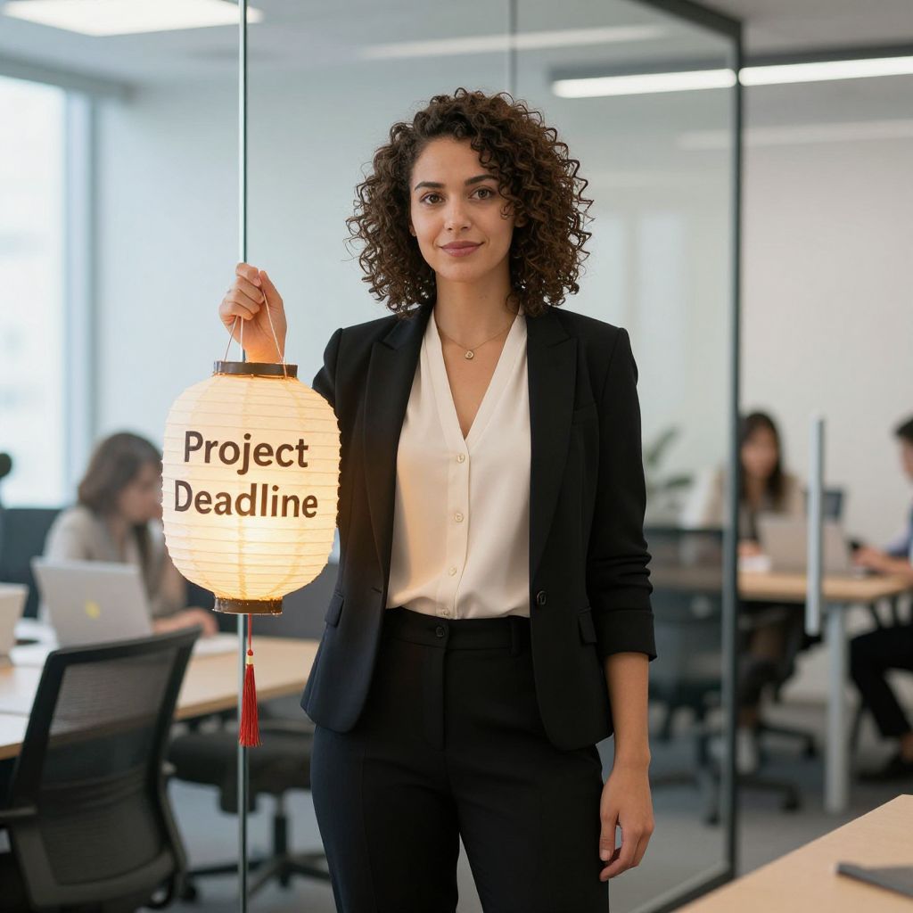 Photograph of a curly-haired woman in a black blazer and white blouse, holding a paper lantern reading "Project Deadline" in a modern, lit