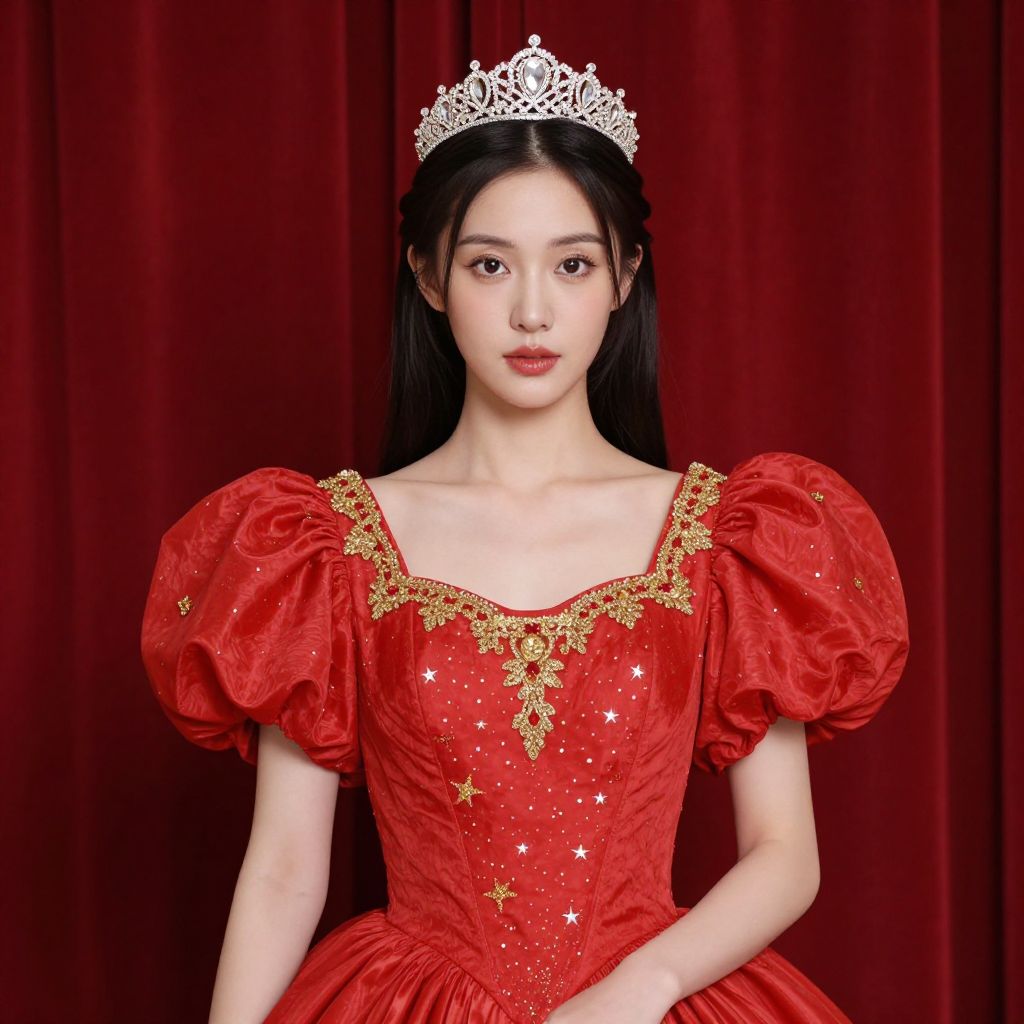 Photograph of an East Asian woman with fair skin and long black hair, wearing a red, medieval-style princess dress with puffed, short sleeves and gold star embroidery on the bodice and skirt. She also has a white, ornate tiara on her head. The dress has a square neckline and a fitted waist. She stands against a rich, red velvet curtain background, with a neutral expression and slightly parted lips. The image has a formal, fairy tale-like quality.