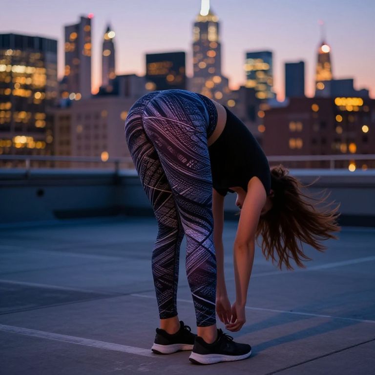 Girl bending over in stylish patterned leggings on a city rooftop, the skyline glowing at dusk in the background, her hair flowing and the leggings reflecting subtle urban lights, high detail and vivid colors.