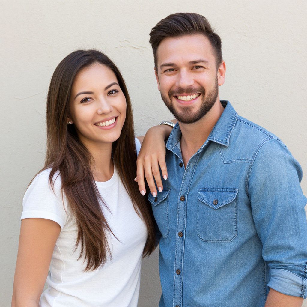 Photograph of a smiling couple standing against a white wall. The woman, with long dark brown hair and medium skin tone, wears a white short-sleeve t-shirt and has her right arm around the man's shoulder. The man, with light skin, dark brown hair, and a trimmed beard, wears a light blue denim shirt with sleeves rolled up. His left arm rests by his side. Both have bright, white teeth and are looking directly at the camera, exuding a warm and friendly vibe. The lighting is bright and even, highlighting their cheerful expressions.