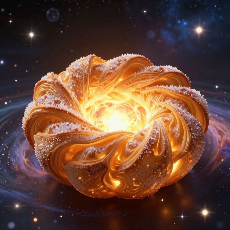 Interstellar pastry artistry unfolds as a supernova is meticulously folded into a golden, sugar-coated shell, its radiant core glowing warmly within the intricate layers, set against a cosmic backdrop of stars and nebulae.