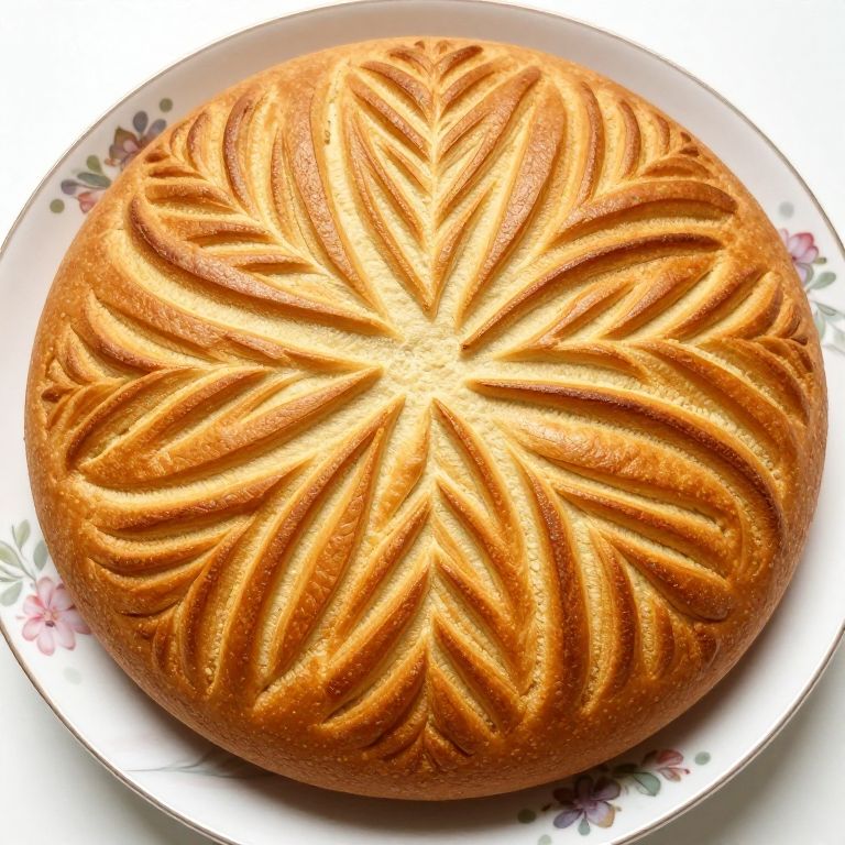 Golden-brown bread rests on a floral-patterned plate, its surface intricately scored with a symmetrical leaf design radiating outward from the center.