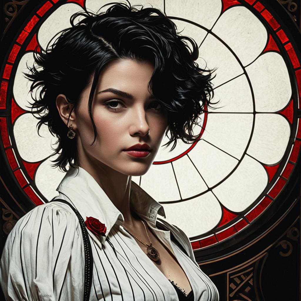 High detailed portrait of an androgynous person with short, wavy black hair, wearing a white striped tuxedo jacket with puffed sleeves and a black lace inner garment. The person has a red rose pinned on the lapel and gold pendant necklace. The background features an ornate circular stained glass window with red and white design, adding an artistic and vintage rockabilly style atmosphere.