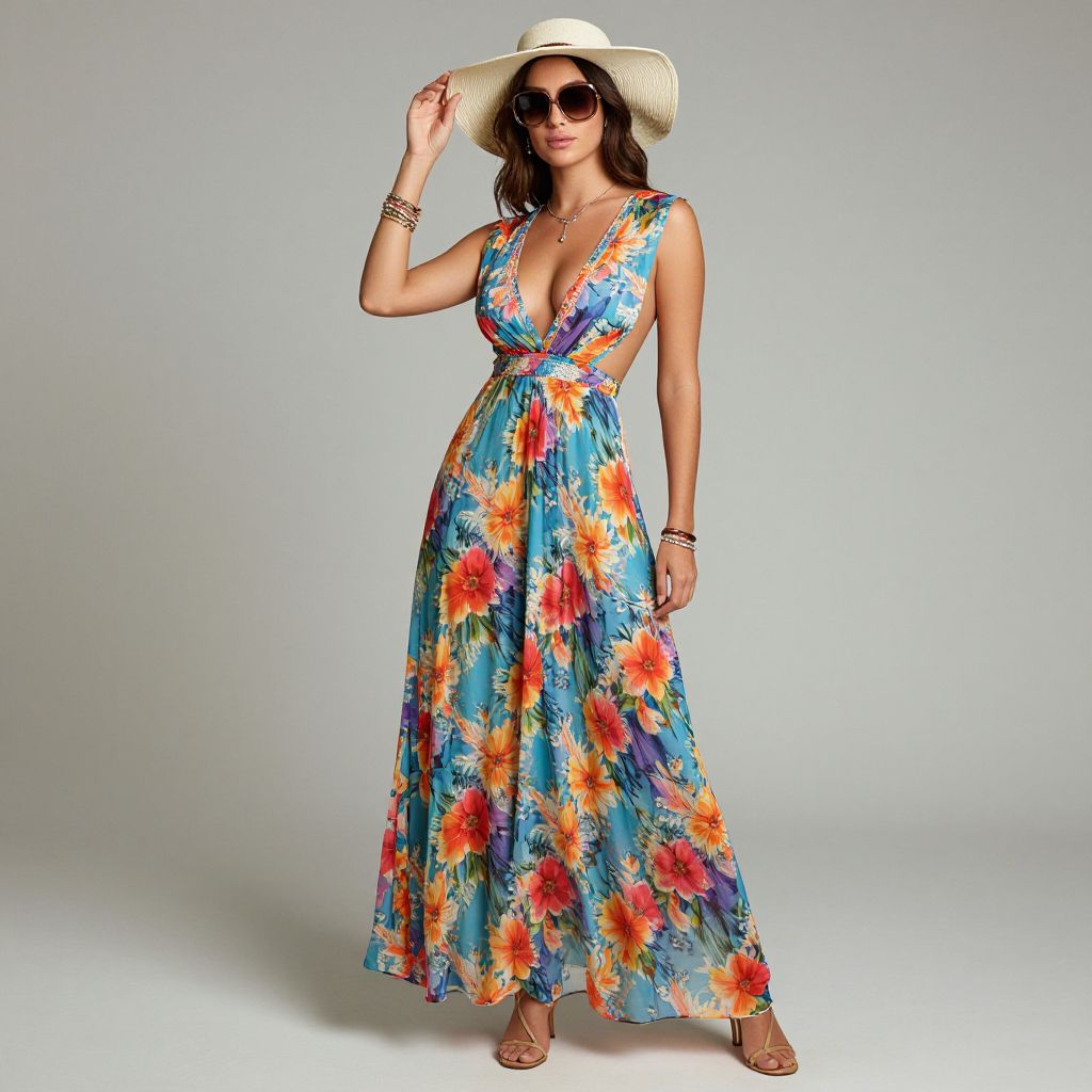 Full body shot, woman, deep V back maxi dress, flowing chiffon fabric, vibrant floral print, sleeveless design, cinched waist, delicate lace trim, ankle-length hem, strappy sandals, wide-brimmed sun hat, oversized sunglasses, bohemian accessories, layered bracelets, natural makeup, soft waves hairstyle Sexy. Pretty face and beаutiful eyes. Big breasts
