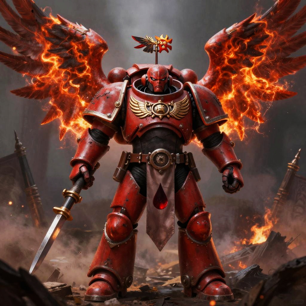 Blood Angels artwork portraying a stoic captain with radiant blood red armor stained with battle scars, angel wings made of fiery energy emerging from his back, holding a banner emblazoned with blood drop iconography, set against a smoky war zone, highly cinematic digital painting.