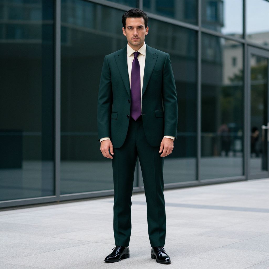 A man, dark green peak lapel suit, ivory dress shirt, deep purple silk tie, black patent leather shoes, slim fit, modern glass facade, cri film style, confident expression, urban sophistication. Man has masculine face and piercing eyes