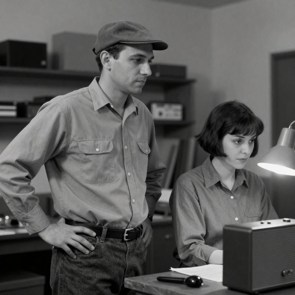 Black-and-white photograph of a curly-haired man in a patterned shirt leaning close to a woman with long, wavy hair and bangs, wearing a light jacket. They are focused on a typewriter in a cluttered room with blurred background objects. The woman looks up at the man with a curious expression.
