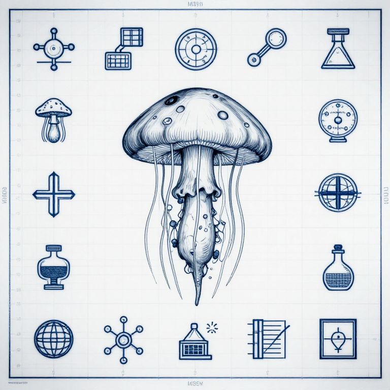 Popular Icons an archive photo of a clinical blueprint containing data and fine-line scientific schemata about a flying mushroom/jellyfish hybrid. official-looking. laboratory lighting.,