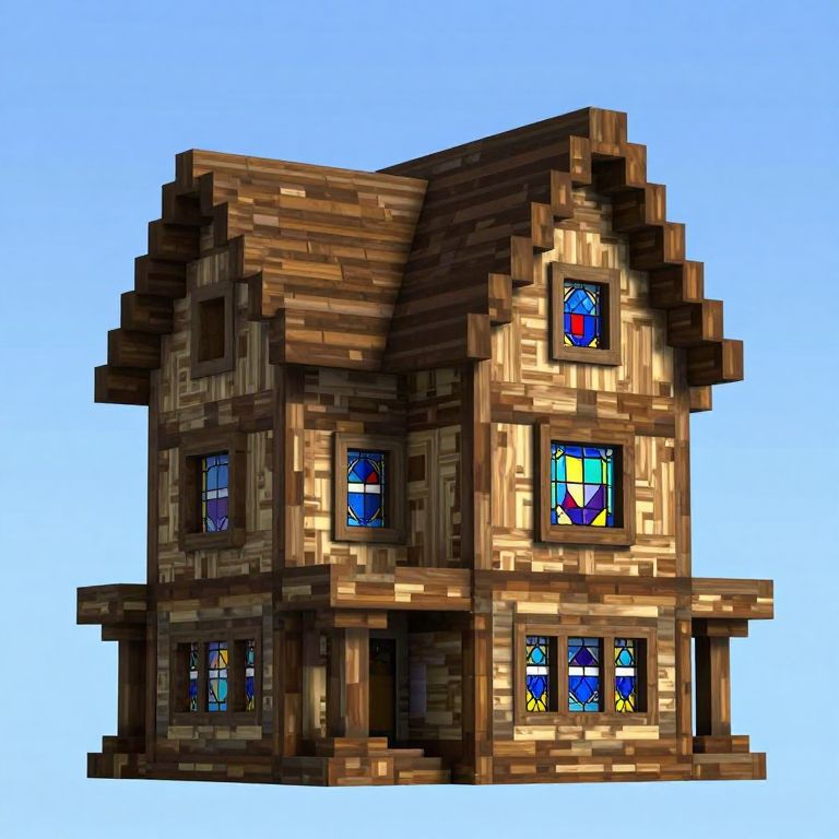 A blocky, pixelated mansion crafted from wood and stained glass windows stands defiantly against a clear blue sky, its geometric precision and intricate design defying the rustic simplicity of survival builds, creating a surreal blend of medieval charm and digital artistry.