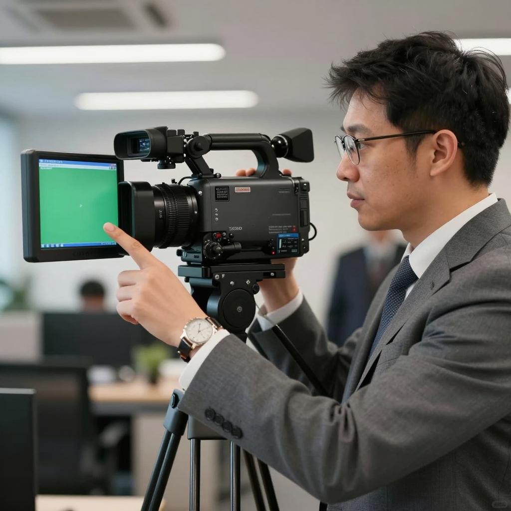 Man in gray suit, white shirt, and patterned tie, using a professional video camera, pointing at a monitor with green . Hand raised in mid-motion, camera mounted on a tripod. Background shows blurred office lights and furniture. Second person partially visible behind the camera operator.