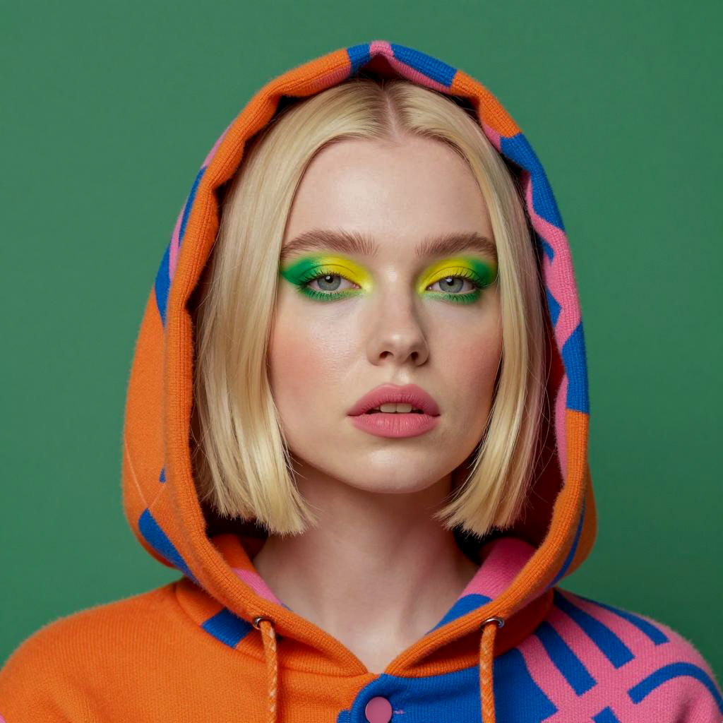 Photograph of a pale-skinned woman with a blunt blonde bob, wearing a colorful, patterned hood. She has vivid green and yellow eye makeup, pink lips, and a neutral expression. The background is solid green. She wears a hood with bright orange, blue, and pink patterns. Her head is slightly turned to the right.