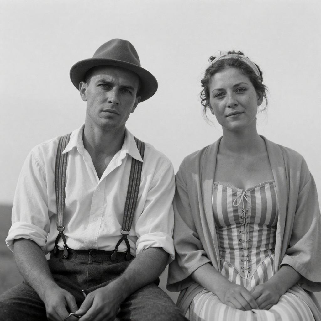 Black and white photograph of two people. Man on left, wearing hat, white shirt, suspenders, holding glasses. Woman on right, topless with striped corset, open robe, headband. Both sitting, facing camera, against plain sky background. Man has intense expression. Woman smiles slightly. Both appear weathered.