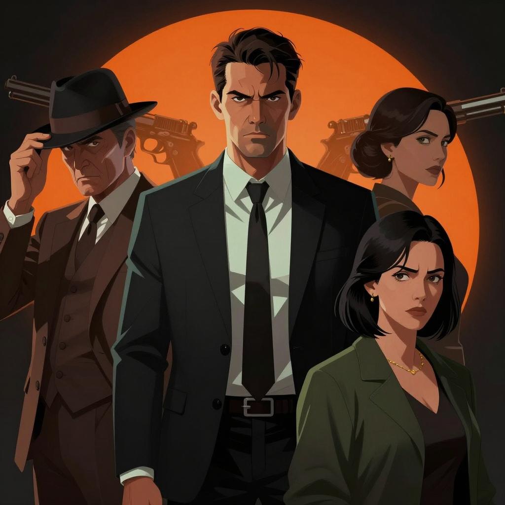 Digital illustration of a woman with a black hat, black coat, and sunglasses, standing with a gun in her right hand. Two men with guns are in front of her. A bust of a bald man with a neutral expression is at the bottom. White background, orange base.