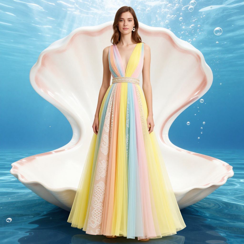 Photograph of a young woman with fair skin and shoulder-length brown hair, standing underwater. She wears a flowing, sleeveless, deep V-neck gown in pastel colors, including yellow, pink, and white, with intricate lace detailing on the white sections. The dress is cinched at the waist with a thin, gold band. She stands in front of a large, white, seashell-shaped structure that glows, with bubbles floating around her. The background is a clear blue ocean, with sunlight filtering through the water, creating a serene and ethereal atmosphere.