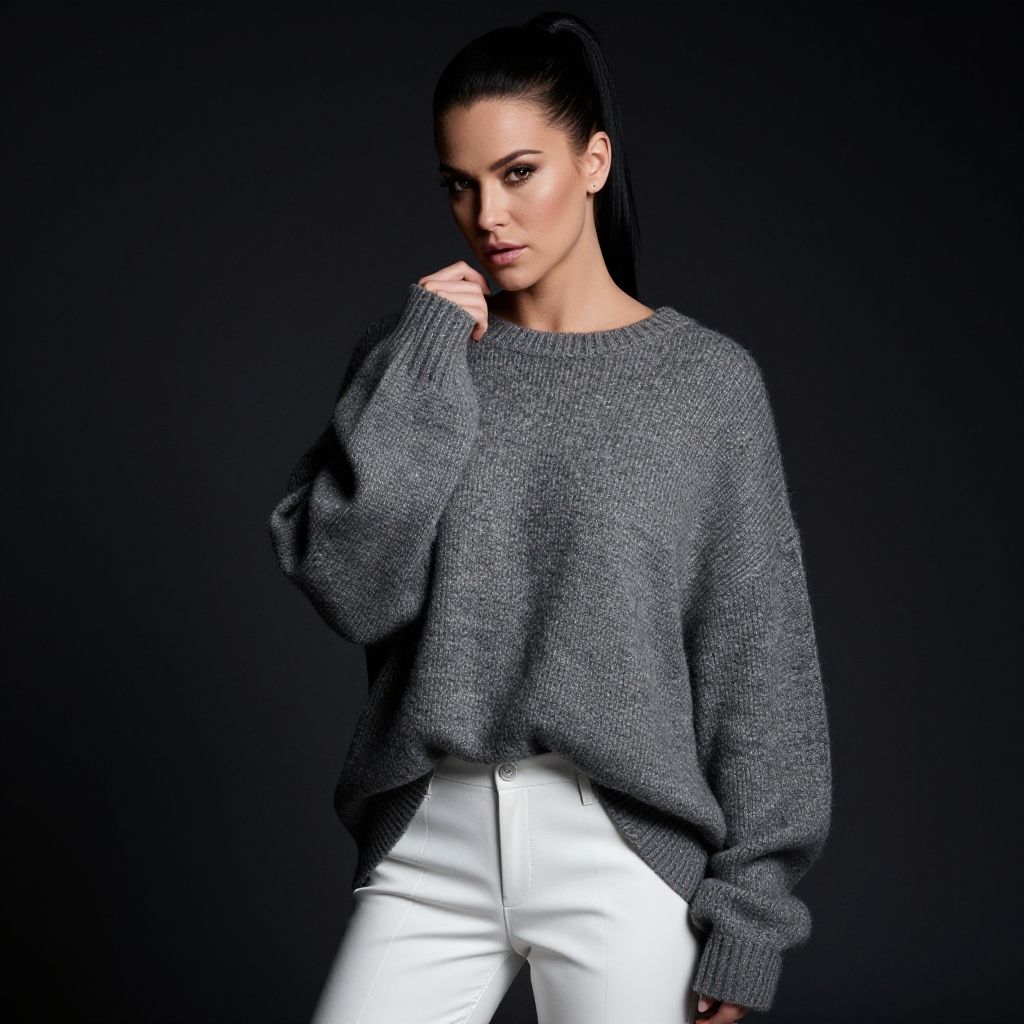 Photograph of a young woman with light brown skin and sleek, black hair pulled back in a high ponytail. She has a slender build and is wearing a loose, dark gray knit sweater with white high-waisted pants. Her right hand gently touches her chin, and she gazes directly at the camera with a neutral expression. The background is solid black, making her the focal point. The lighting is soft but directional, highlighting the texture of her sweater and the smoothness of her pants. The overall style is modern and minimalist.