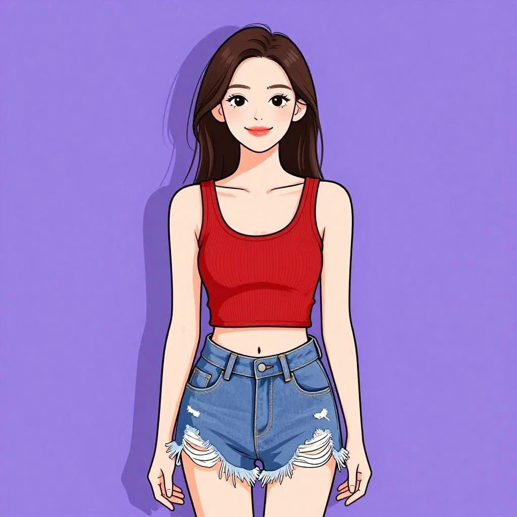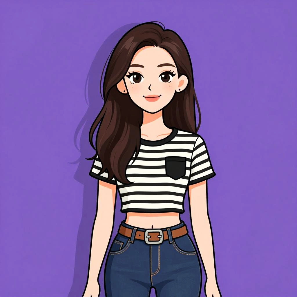 Woman with pretty face and pretty hair. Woman, casual, cropped knit sweater in neutral tones, crew neck, short sleeves, high-waisted black skinny jeans, silver bangle bracelets. --sref 1467