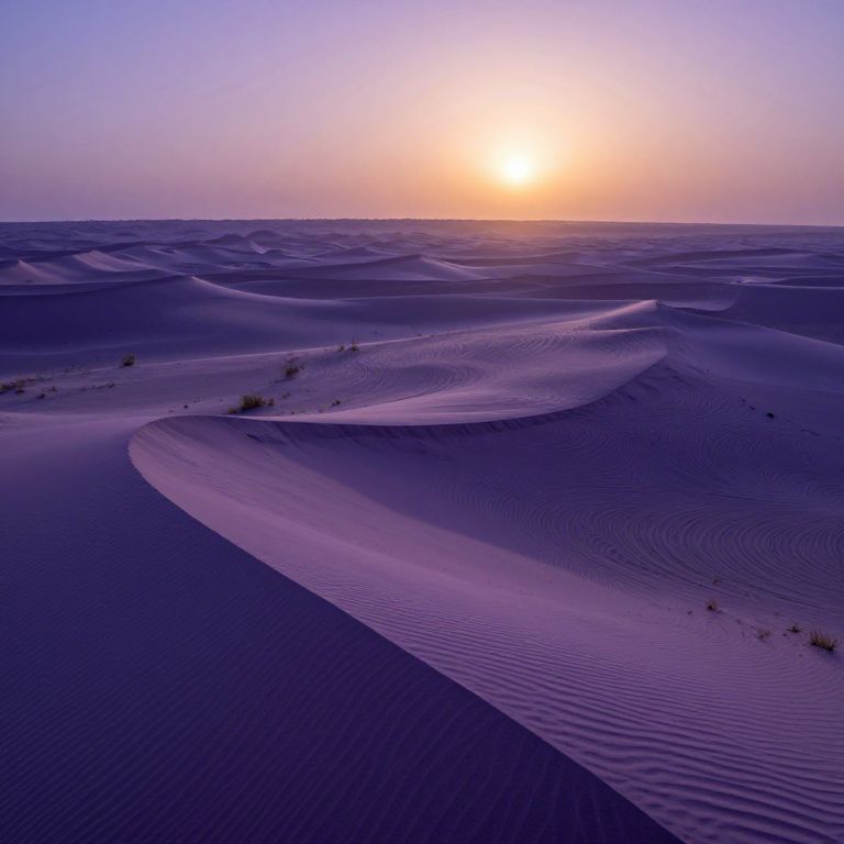 A mesmerizing image captures the essence of an alien world's surface, reminiscent of Van Gogh's swirling landscapes. From a high vantage point, we observe expansive violet dunes stretching to the horizon, with intricate patterns evoking a sense of cosmic wonder. The scene is bathed in dual suns, casting elongated shadows across the otherworldly terrain as if time has slowed down in this captivating location. The emotional journey shifts from awe-inspiring beauty to an enigmatic solitude, beckoning viewers to venture into the unexplored realms of imagination.