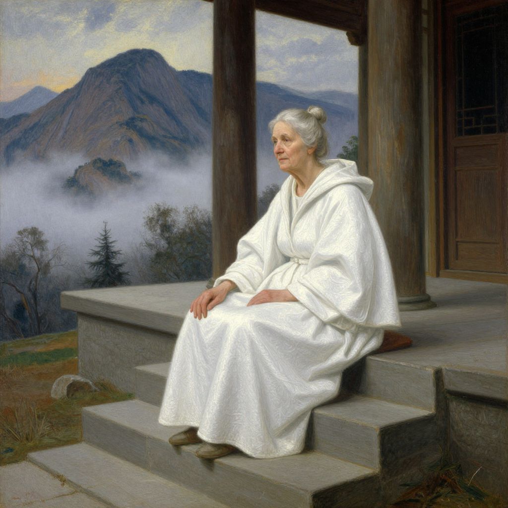 This is a digital painting depicting an elderly woman with white hair, sitting on stone steps outside a wooden building. She wears a white, hooded robe with a textured, slightly shiny fabric. Her light skin and serene expression suggest calmness. The background features a misty mountain landscape with blue and purple hues, and a partially visible wooden door to the right. The steps she sits on are grey and lead to a covered porch supported by large wooden columns. A small, weathered stone is on the ground to the left. The overall style is realistic with a touch of romanticism.
