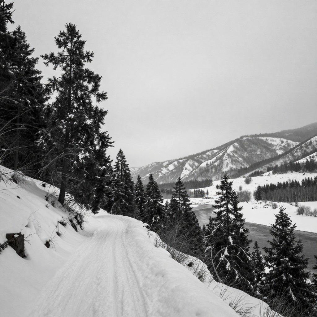 No humans, scenery, outdoors, tree, nature, mountain, road, snow, forest, sky, pine tree, monochrome, river, landscape, day, mountainous horizon, traditional media, winter, greyscale