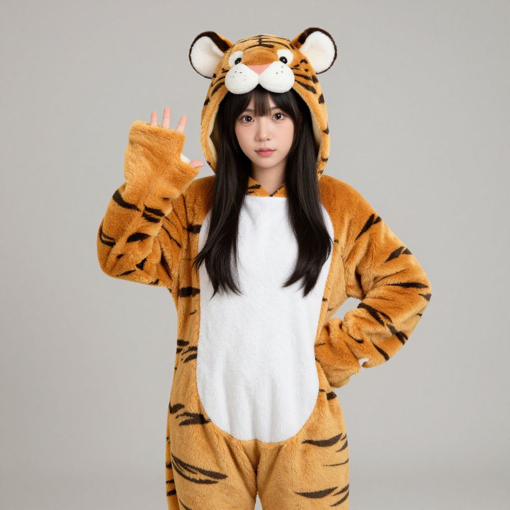 Asian woman in tiger onesie with hood, striped fur, white belly, black hair, waving right hand, neutral gray background.