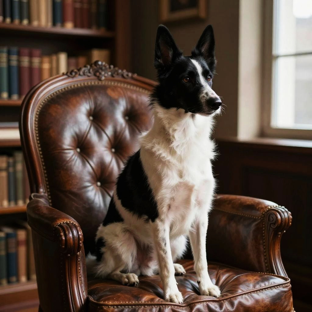 Photograph of a black-and-white Border Collie sitting on an ornate, brown leather chair in a dimly lit library with bookshelves in