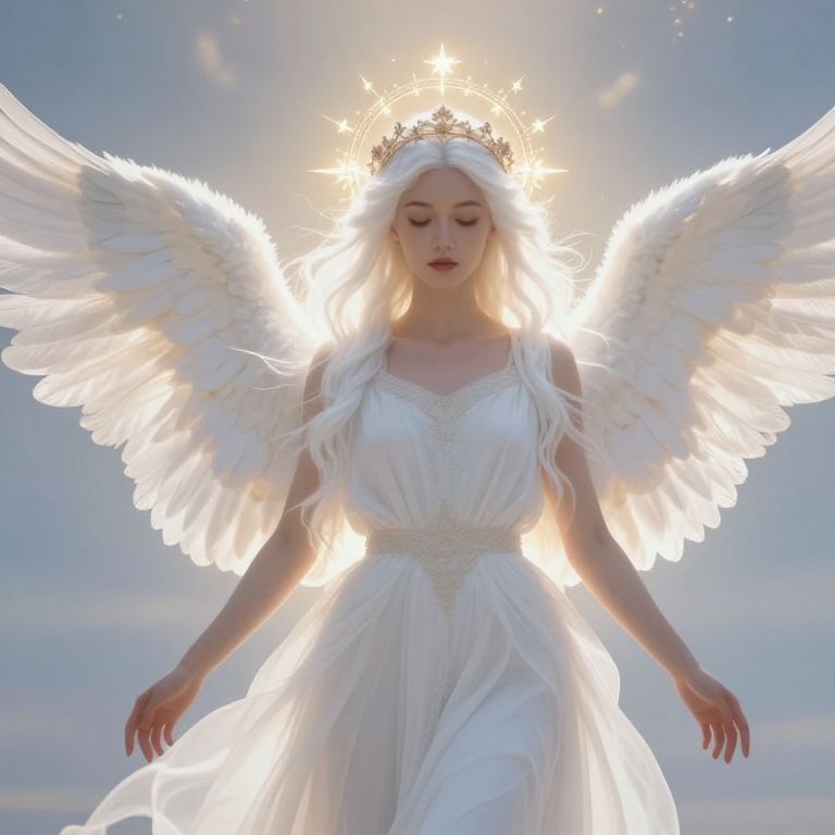 A beautiful female angel with flowing white hair, serene and peaceful expression, standing gracefully with large, delicate white wings fully extended behind her, glowing softly with a gentle luminous light. She wears a radiant, celestial crown adorned with tiny stars and floral motifs, symbolizing purity and divine grace. The background is a soft, ethereal sky with subtle gradients of blue and gold, enhancing the sacred and majestic atmosphere. The overall mood is calm, holy, and inspiring.