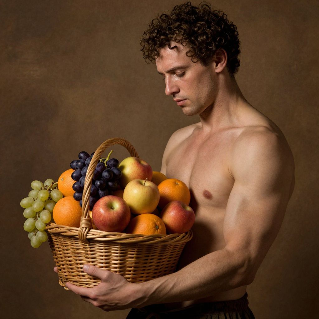 Photograph of a muscular, shirtless Caucasian man with curly brown hair, gazing downward at a wicker basket filled with assorted fruits, including apples, oranges, grapes, and pears. His skin is fair, and he has a defined, athletic physique with visible muscle tone. He holds the basket with both hands against a plain, brown, textured background. The lighting highlights the contours of his body and the vibrant colors of the fruit, creating a classic, almost Renaissance-like aesthetic. The basket is centrally positioned, and the man is slightly to the right, creating a balanced composition.