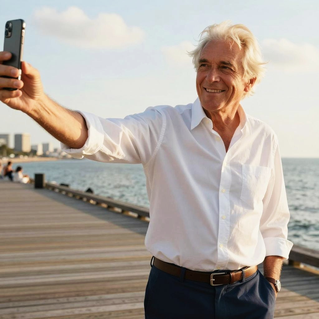 A candid smartphone selfie of a blonde teenage boy at urban street with graffiti wall, wearing grey hoodie and black jeans. Right arm extended toward the lens, relaxed smile, eyes to camera. Golden natural light, soft shadows, true-to-life colors, subtle grain, shallow depth of field. Background details: horizon line, reflective water or city skyline, light clouds. Realistic skin texture, crisp focus on eyes, gentle breeze in hair, upbeat lifestyle vibe.