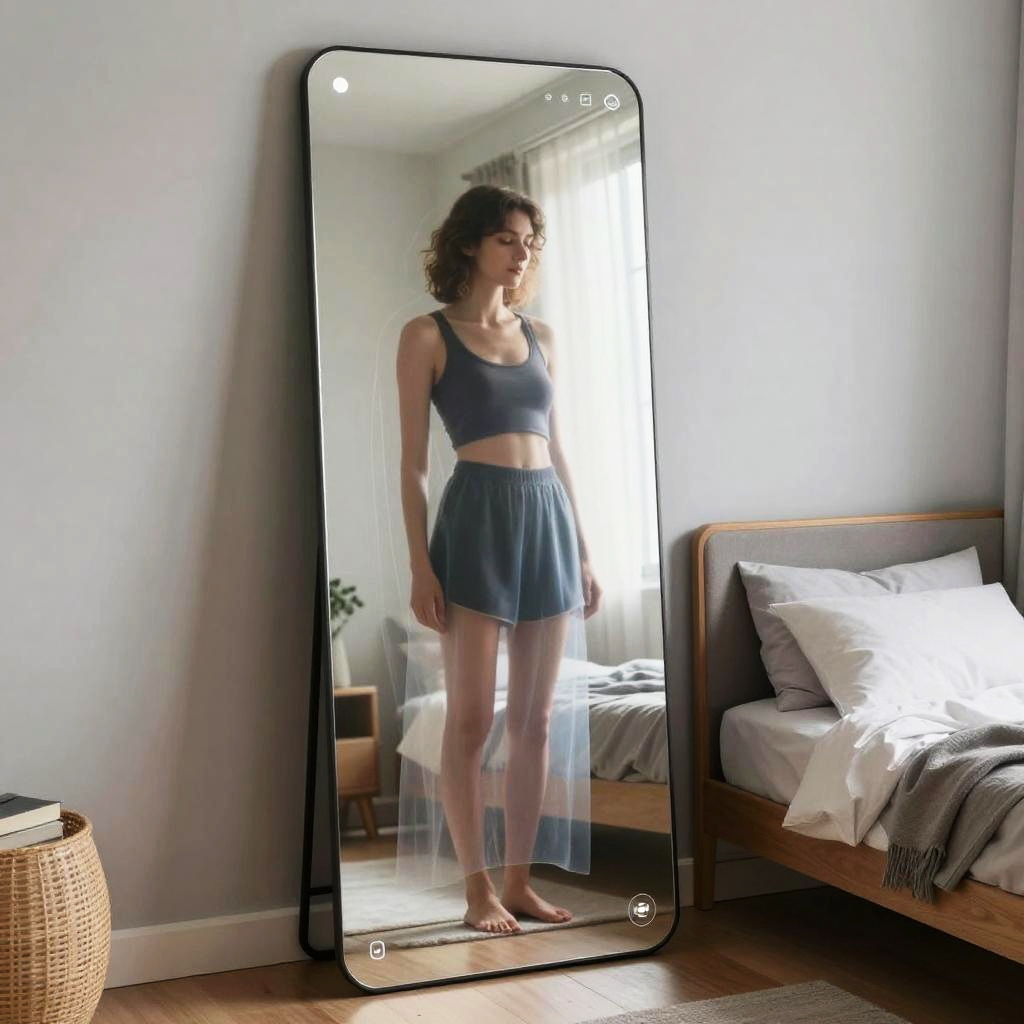 Remove clothing AI free concept, an advanced AI-powered mirror reflecting a person while transparent layers of clothing fade away, modern bedroom setting, soft natural light, clean interface, subtle tech elements blending with human form
