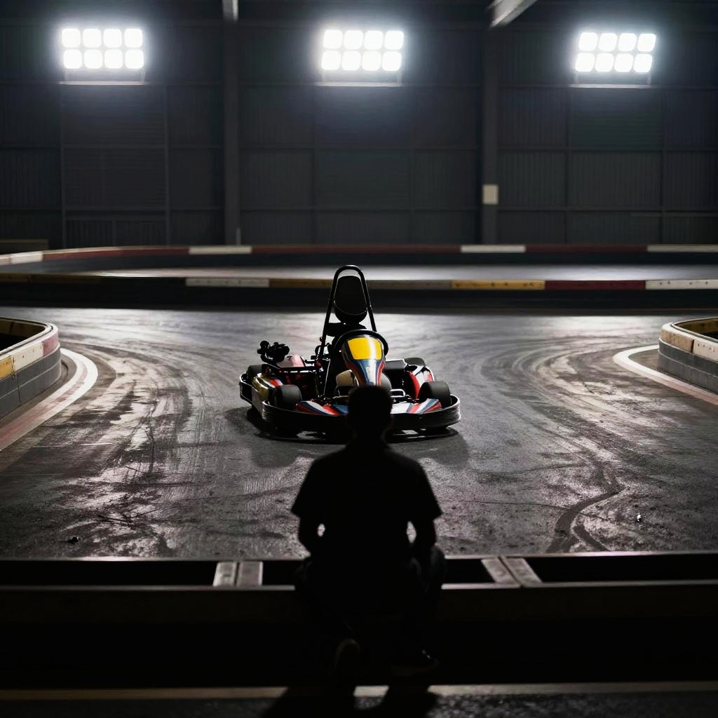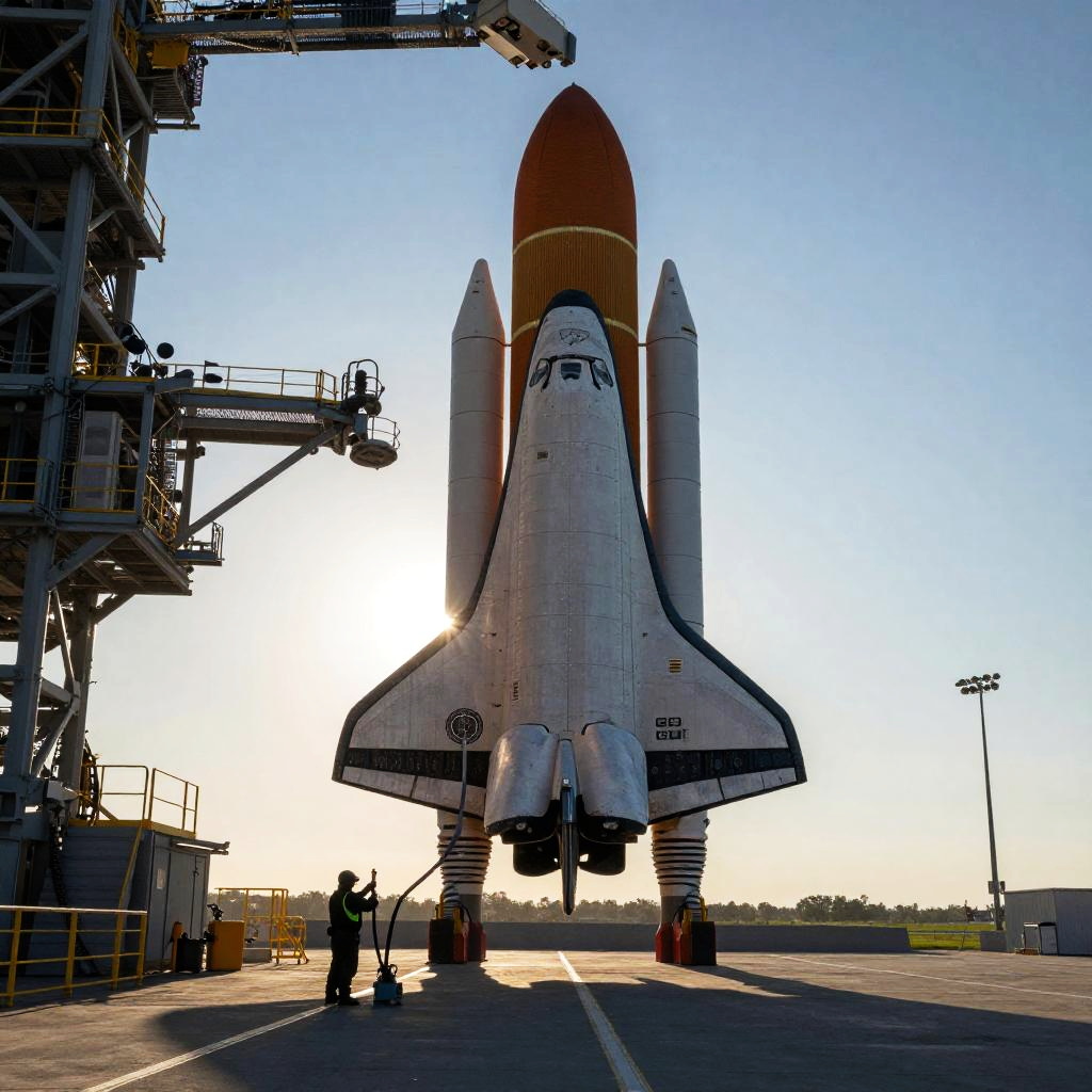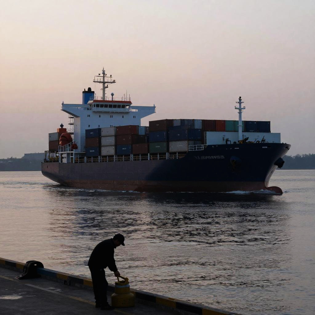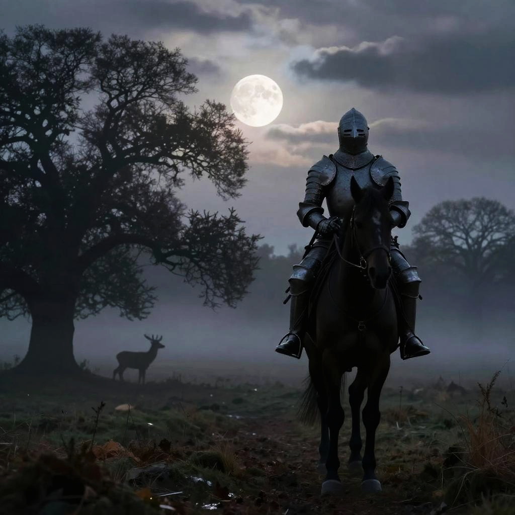 Silhouette of a cowboy wearing a hat standing in a vast desert landscape during sunset. Above, a large airship with illuminated windows is flying against a sky filled with soft pink and orange hues. Mountains appear in the distant horizon, creating a serene and dramatic scene.