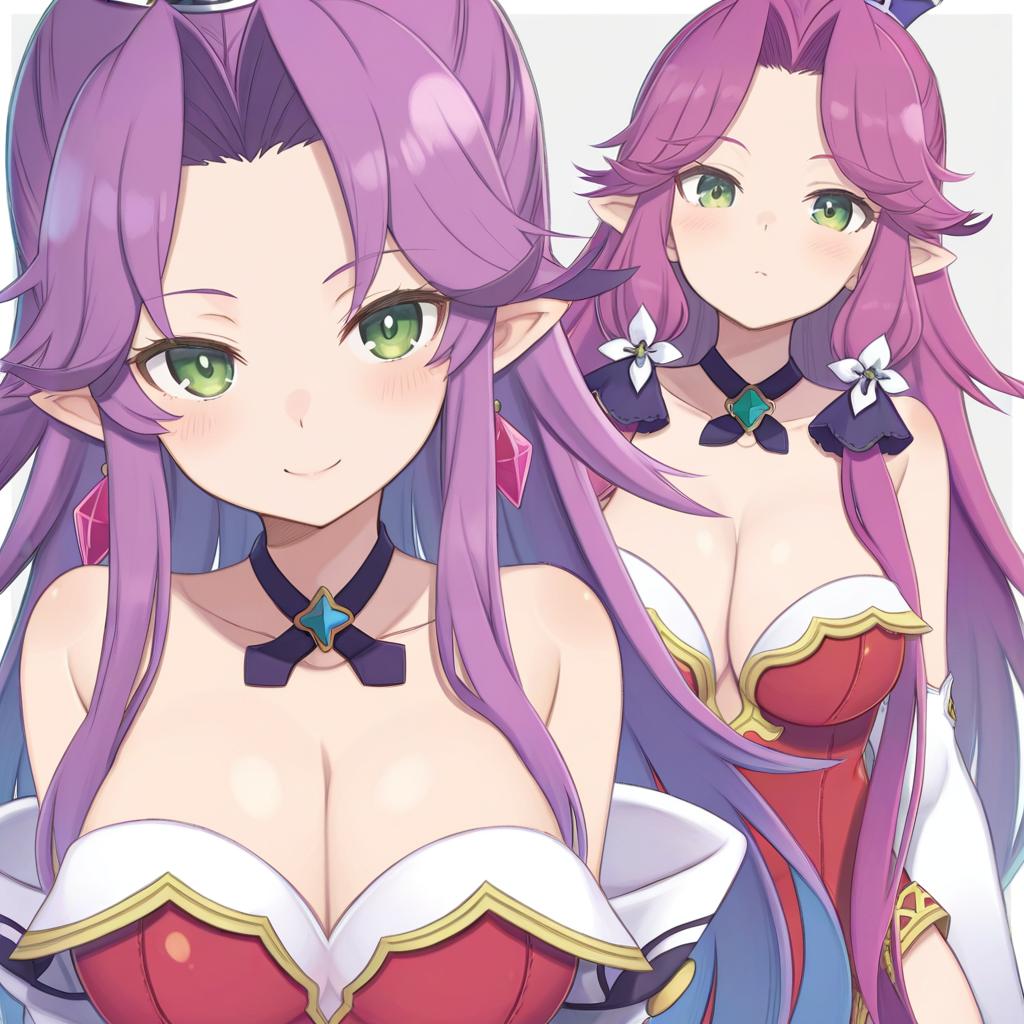 Angela (seiken densetsu 3), seiken densetsu, 1girl, pointy ears, green eyes, purple hair, long hair, very long hair, large breasts, medium breasts, cleavage, red leotard, red leotard, bare shoulders, earrings, by artist totatokeke, illustrious