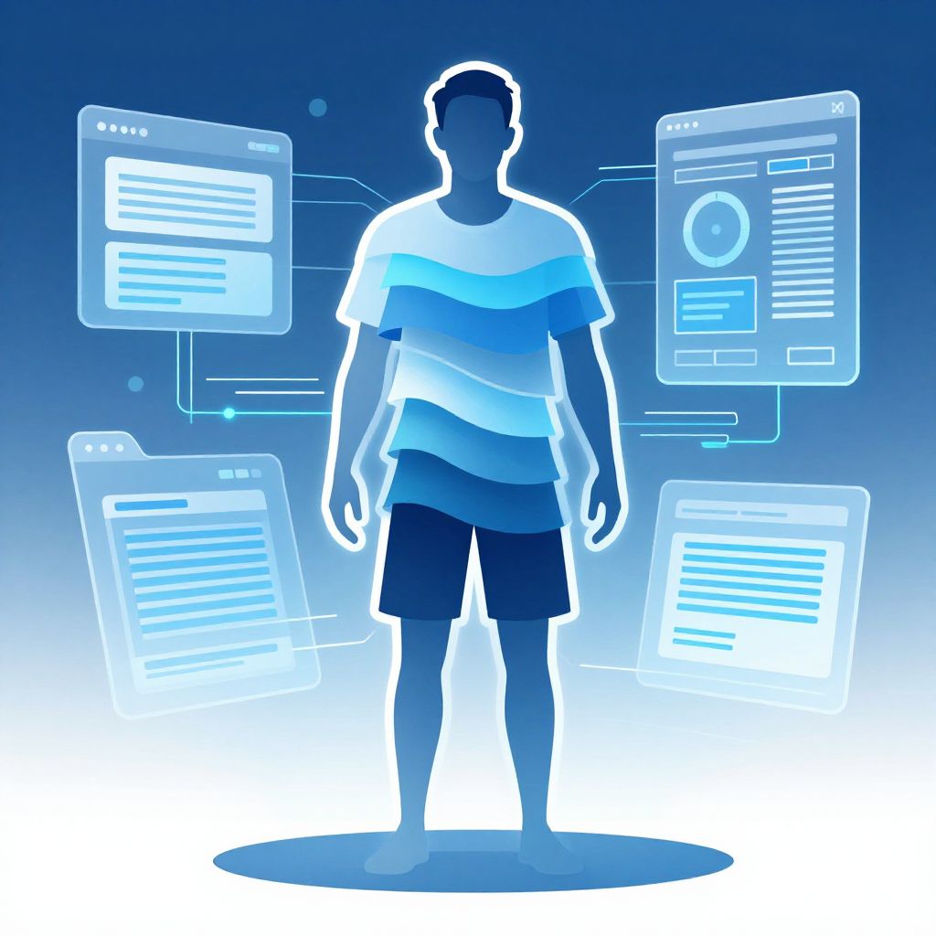 Illustration of AI clothes remover software in action, showing digital clothing layers dissolving from a human silhouette surrounded by virtual screens and data streams, with a cool blue and white color palette and a modern sci-fi feel