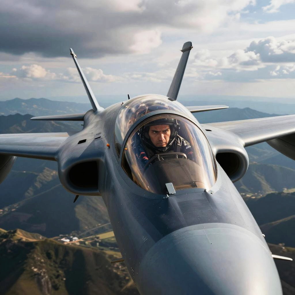Photograph of a male pilot in a clear cockpit canopy of a sleek, grey military jet aircraft, flying over a mountainous landscape. The pilot, wearing a dark flight suit and helmet, gazes directly at the camera with a focused expression. The jet's wings and twin engines are visible, with the background showcasing rugged mountains and a partly cloudy sky. The image captures the jet from a low-angle front perspective, emphasizing the aircraft's streamlined design and the pilot's concentration. The light creates a dynamic contrast between the jet's metallic surface and the natural scenery below.