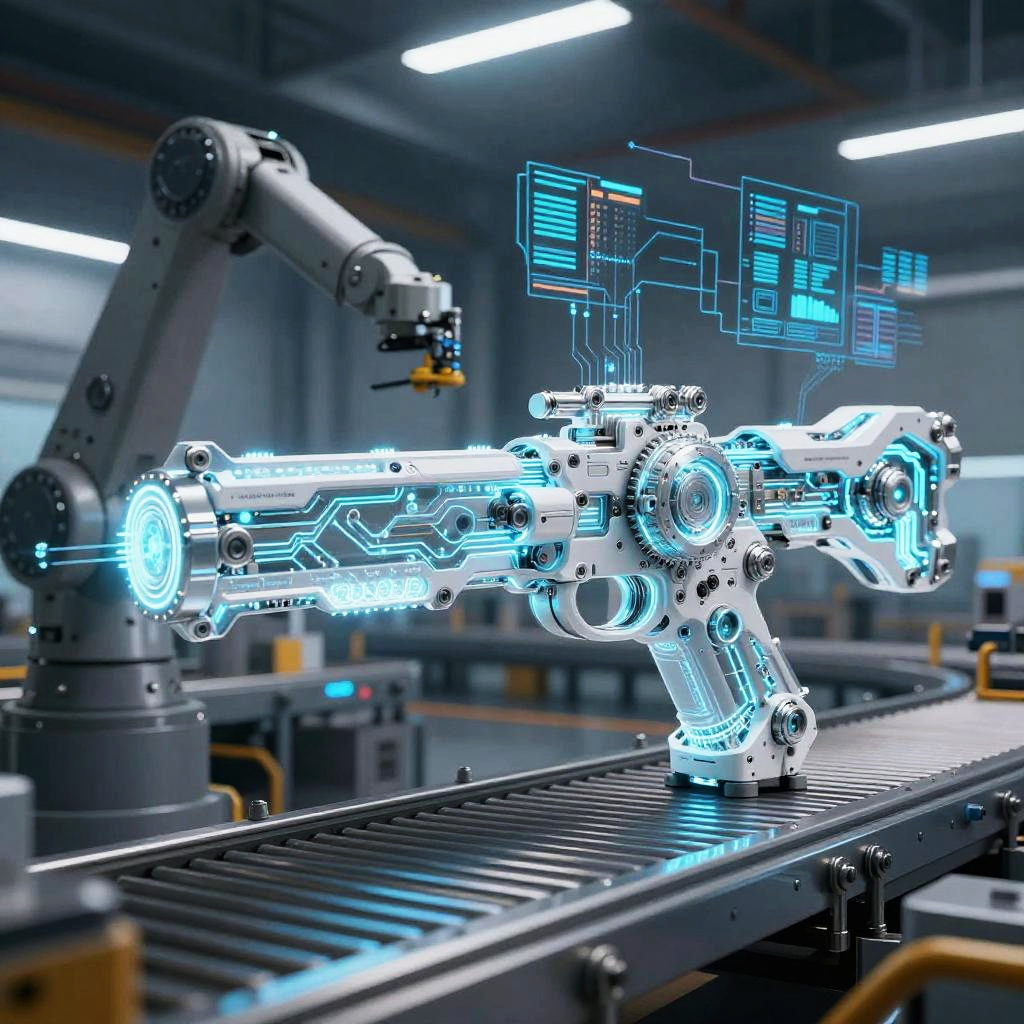 AI weapon generator, advanced artificial intelligence system creating customizable weapons with glowing circuits and intricate mechanical parts, set against a background of a futuristic factory with robotic conveyors and digital data streams, ultra-modern and innovative
