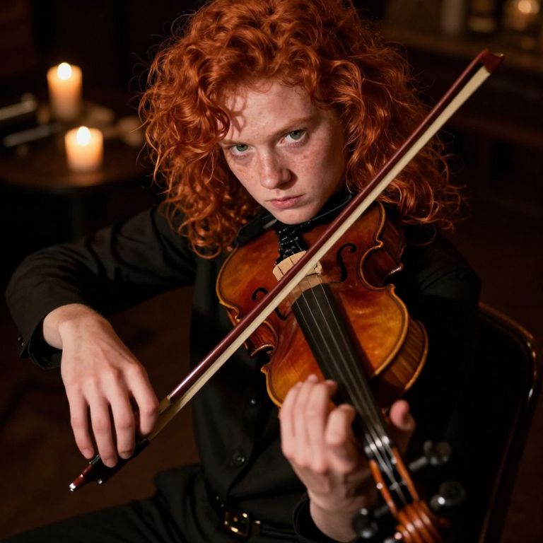 A young blind violinist with warm green eyes and fiery red hair sits in a dimly lit jazz club. Her hands gracefully manipulate the strings of her antique violin as she performs an emotionally charged melody. The soft amber glow from nearby candles casts dramatic shadows across her face, adding to the intensity of her passionate performance. From above, capture the interplay between her fingers and the instrument, showcasing the tough texture of her skin against the rich warmth of the violin. This bird's-eye view invites viewers into an intimate setting filled with anticipation and awe, resonating with raw emotion.