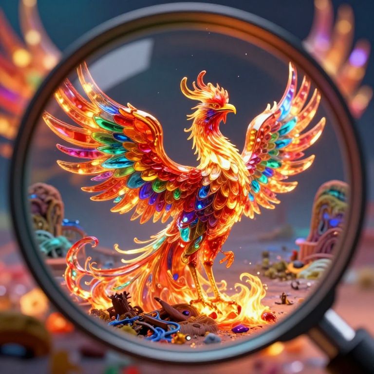 A vivid digital art piece depicts a grand phoenix, its form composed of shimmering glass, ablaze in a kaleidoscope of vibrant hues as it rises from the remnants of its former self. The scene is viewed through a magnifying lens, intensifying the microscopic intricacies of the fiery plumes and the molten glass-like contours of its body. In the background, an otherworldly terrain appears, with elements reminiscent of surreal landscapes where the concept of time and space are distorted, creating a captivating atmosphere filled with wonder and amazement.
