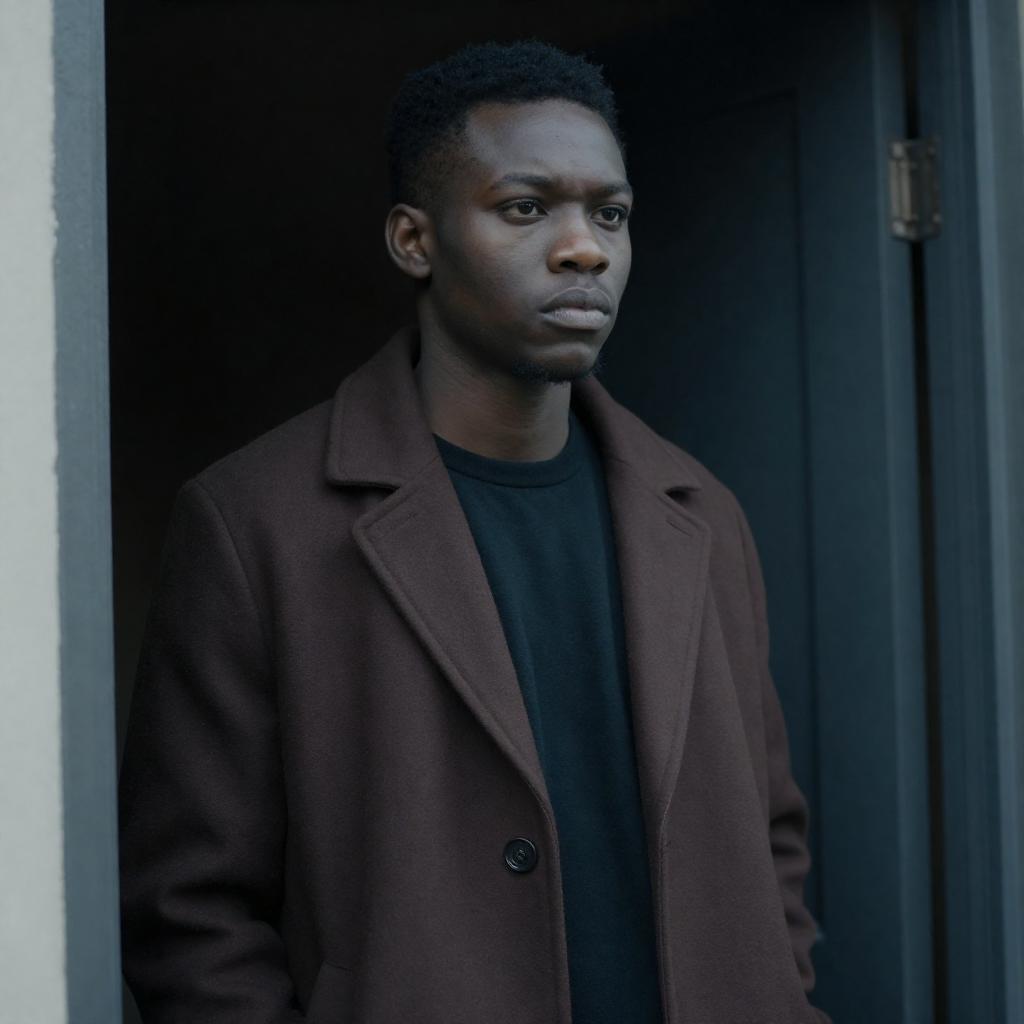 Photograph of a man in a brown, patterned coat standing in a dimly lit room with a dark blue wall and a copper-colored, ornate lamp on the right. He has short, curly hair and gazes to the left. The yellow border contrasts with the dark background.