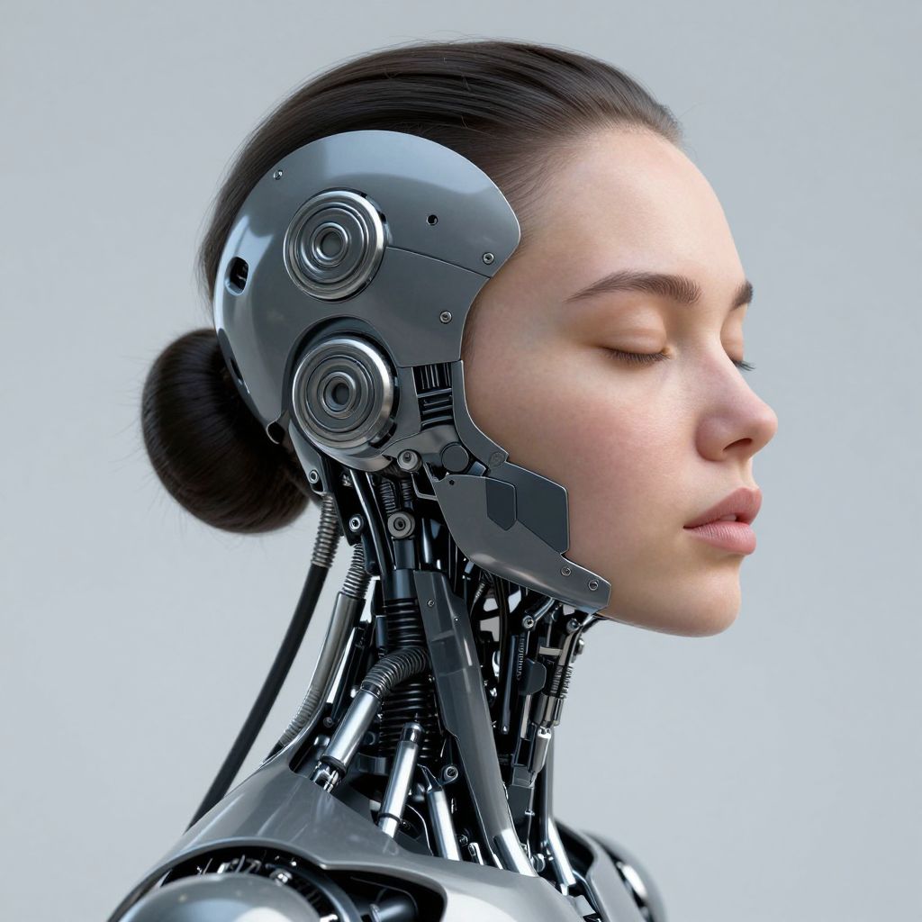 Digital artwork of a futuristic woman with cybernetic head, closed eyes, and dark hair in a bun, showcasing metallic robotic components.