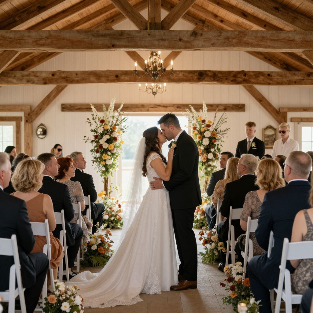 Photograph of a wedding ceremony in a rustic barn with wooden beams, bride in white lace gown and groom in black suit, kissing, surrounded by guests