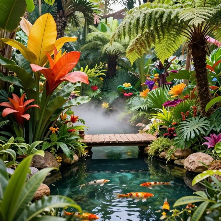 Jardin themed with exotic tropical plants, giant colorful flowers and ferns, a small wooden bridge crossing a crystal-clear pond with koi fish, mist hovering gently above the water, vibrant green foliage, a hidden paradise feeling, perfect for a quiet retreat.
