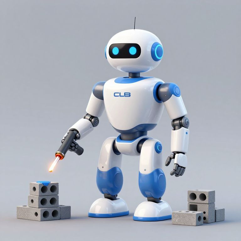 Accessories ultra-modern construction robot coloured white and blue, 3d, cinder blocks, blowtorch, paint, futuristic, minimalistic, isolated, pixar,