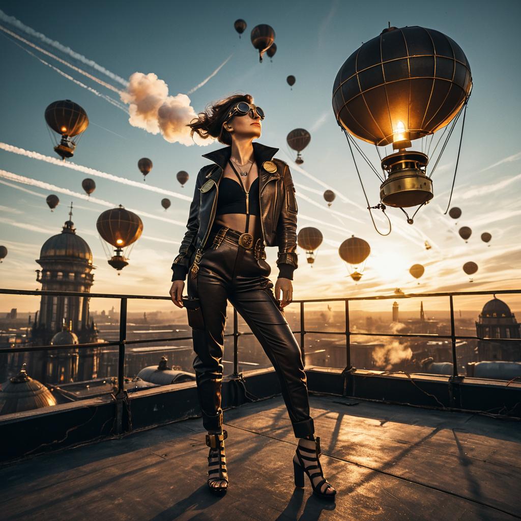 A steampunk aviator woman stands confidently on a rooftop at sunset, surrounded by flying airships and glowing lanterns. She wears a black leather bomber jacket with brass buckles, high-waist tailored trousers, brass goggles on her forehead, and strappy high-heeled sandals. The scene features drifting smoke trails and a cinematic wide-angle perspective, giving a hyper-detailed CGI rendered futuristic vintage aesthetic.