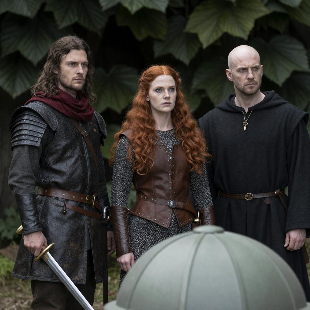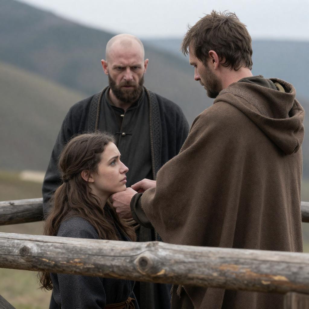 Photograph of a dimly lit medieval scene. A man with short brown hair, wearing a black robe, holds a silver goblet. A bald man lies on the ground, face up, partially illuminated by a candle. Stone wall and candlesticks in background. Intense expression on the standing man's face. Two people, one candle, stone wall.