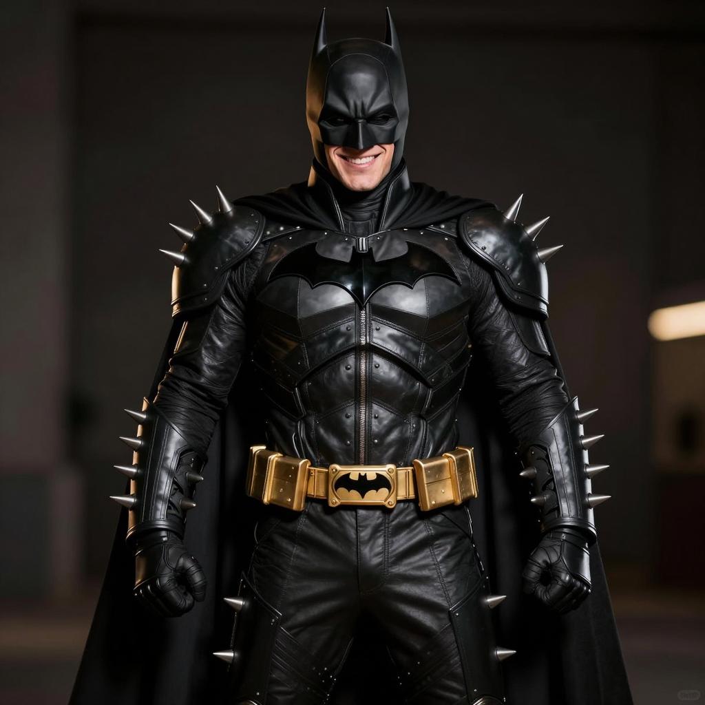 Portrait of a person dressed in a detailed Batman cosplay costume featuring black spiked leather armor jacket, fitted black pants, and a black cape. The costume includes jagged spikes on the shoulders, arms, and legs, with a black Bat emblem on the chest and a gold Bat belt buckle. The subject has a sharp-toothed smile visible under the Batman mask. The background is dark with cinematic lighting and depth of field effects.